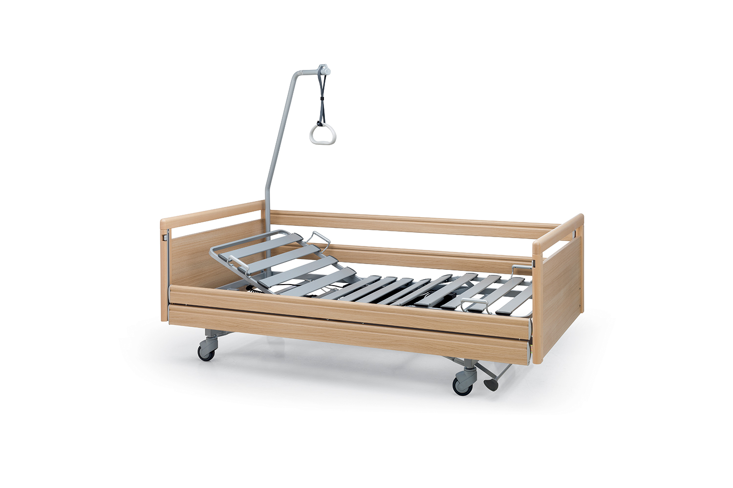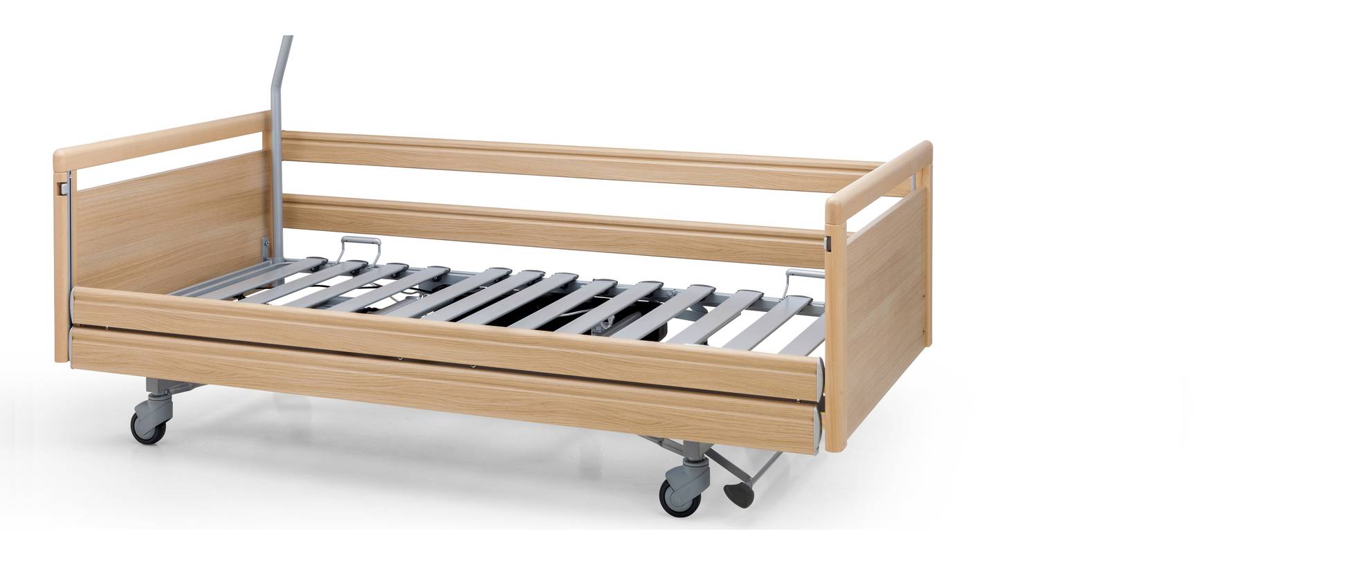 Possibilità di aggiungere l’asta per sollevarsi dal letto, completa di maniglia a triangolo regolabile (comunemente chiamata Asta Alzamalati) oppure l’Asta Flebo con inserto diretto sul piano rete.
